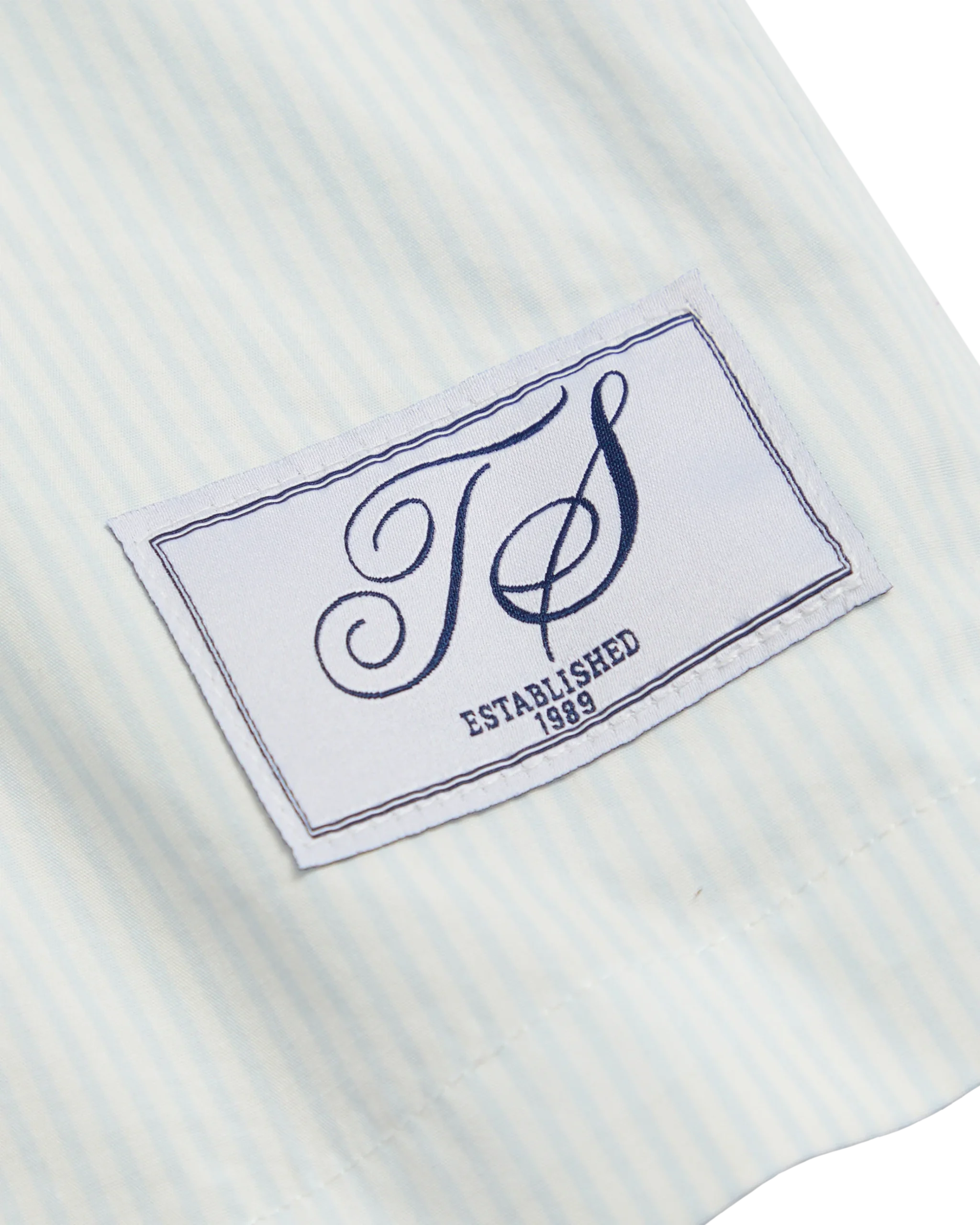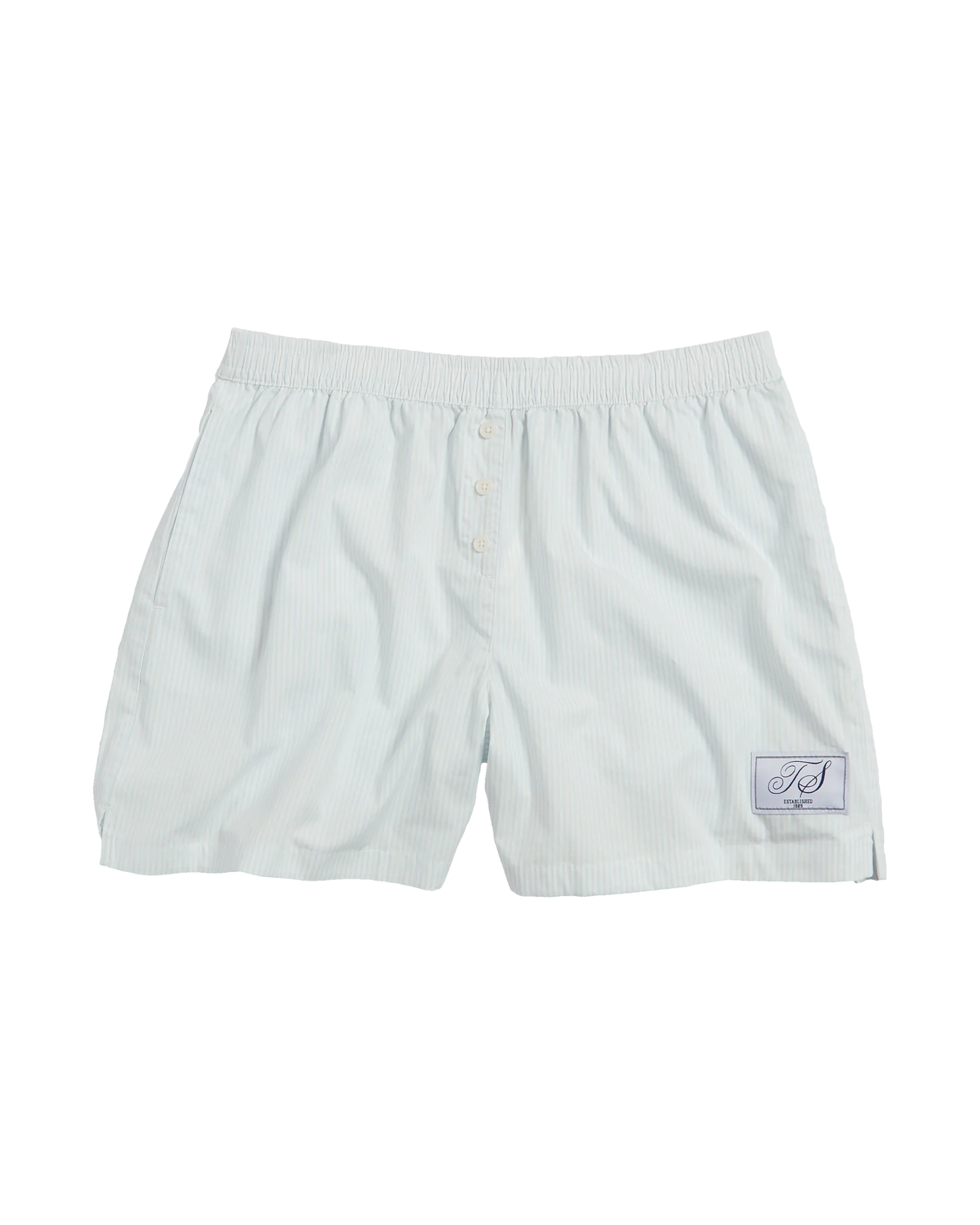 Blue stripe poplin woven shorts with elastic waist, side pockets, side slits and nonfunctional fly and three buttons featuring “TS Established 1989” woven label affixed to wearer’s left hem.