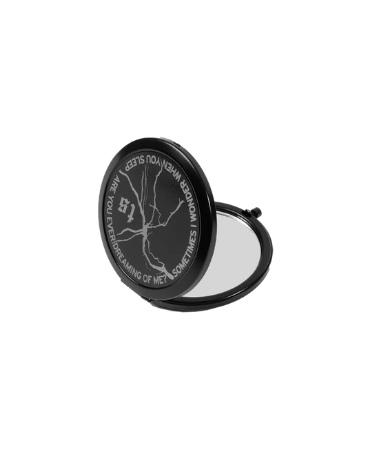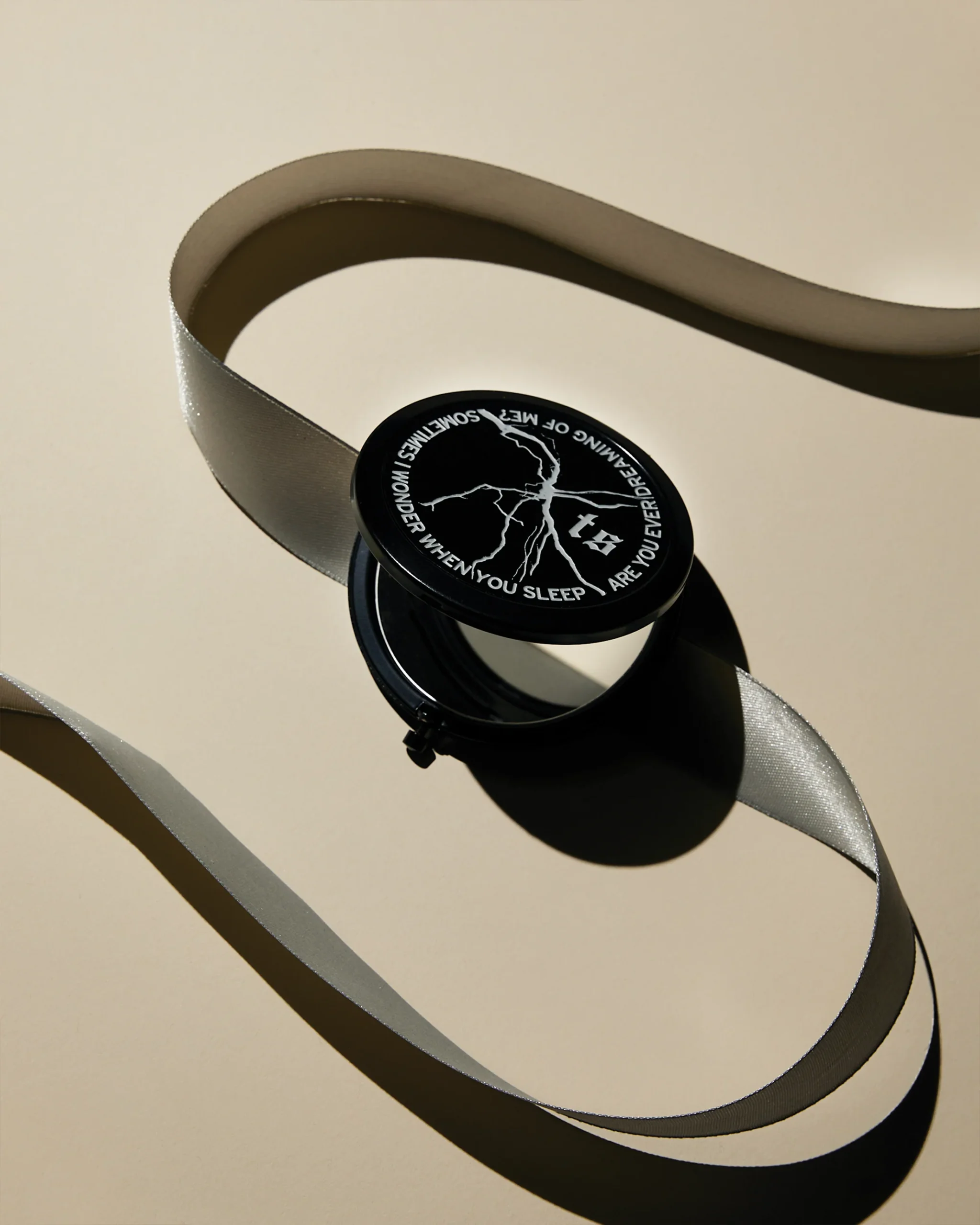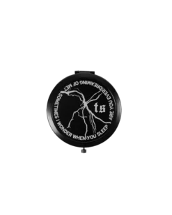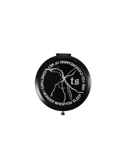 Black compact mirror featuring “Sometimes I wonder when you sleep, are you ever dreaming of me?” song lyrics and “TS” with cracked silver design etched on top.
