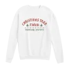 Blue sweater featuring trees, farmhouse, fireplace, and cats knit in with wrap around “Christmas Tree Farm” song lyrics, “To Dance Under Sparkling Lights” song lyrics, and “Taylor Swift” repeating knit text and navy trim at neck, sleeve, and bottom hem.