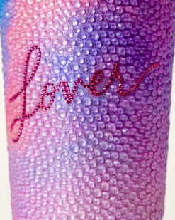 Lover album cloud print all over sparkly tumbler with lid and pink sparkle reusable straw featuring “Lover” album logo on front.