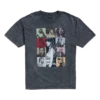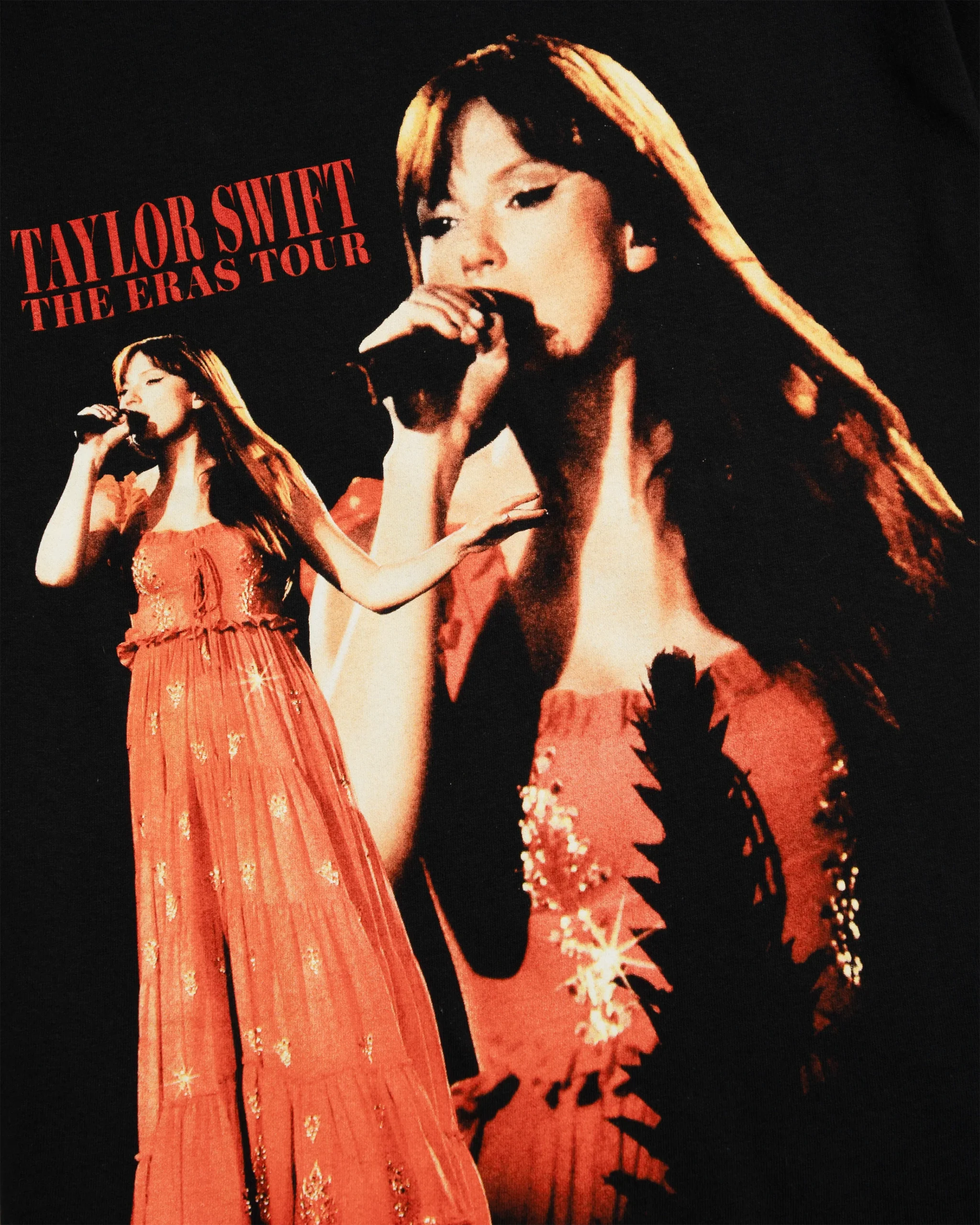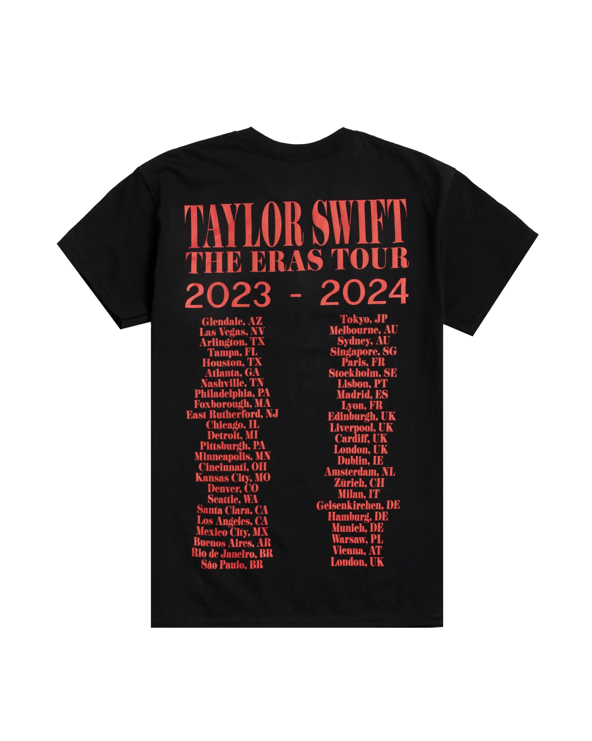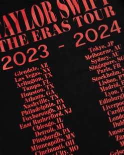 Black t-shirt featuring photo of Taylor Swift and “Taylor Swift | The Eras Tour” printed on front with “Taylor Swift | The Eras Tour 2023 – 2024” and tour locations printed on back.