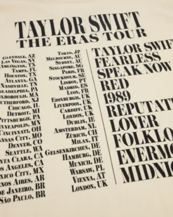 Gray tote bag featuring photos of Taylor Swift printed on front and “Taylor Swift | The Eras Tour” with tour locations through Vancouver printed on back.