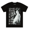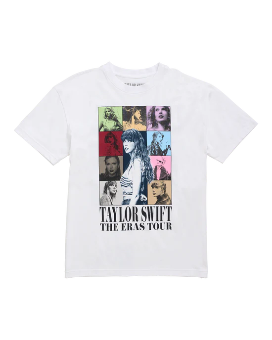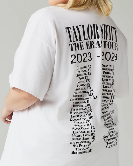 White t-shirt featuring photos of Taylor Swift and “Taylor Swift The Eras Tour” printed on front with “Taylor Swift The Eras Tour 2023 – 2024” and tour locations through Vancouver printed on back.