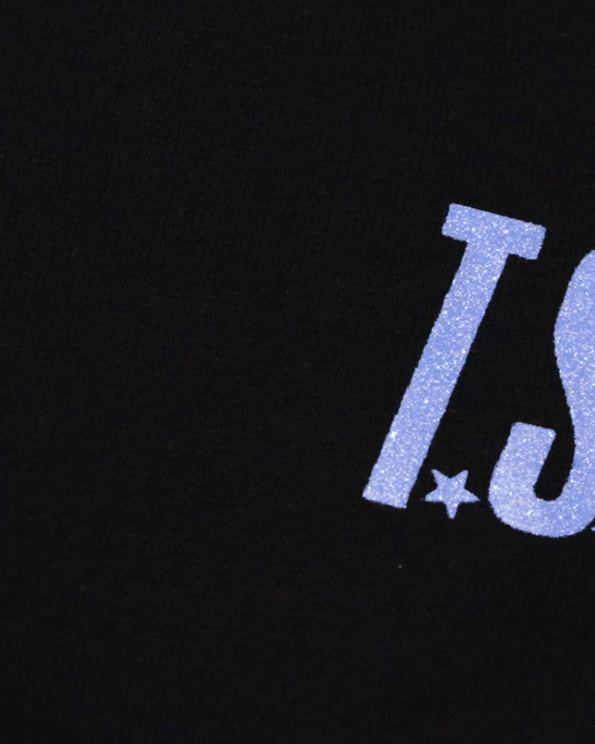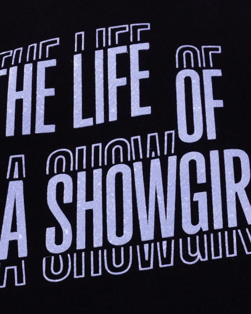 BLACK LONG SLEEVE CREWNECK SWEATSHIRT FEATURING “THE LIFE OF A SHOWGIRL” ALBUM LOGO IN VIOLET SPARKLE PRINT ON FRONT AND “THE LIFE OF A SHOWGIRL” ALBUM LOGO IN VIOLET SPARKLE WITH PHOTOS OF TAYLOR SWIFT PRINTED ON BACK.
