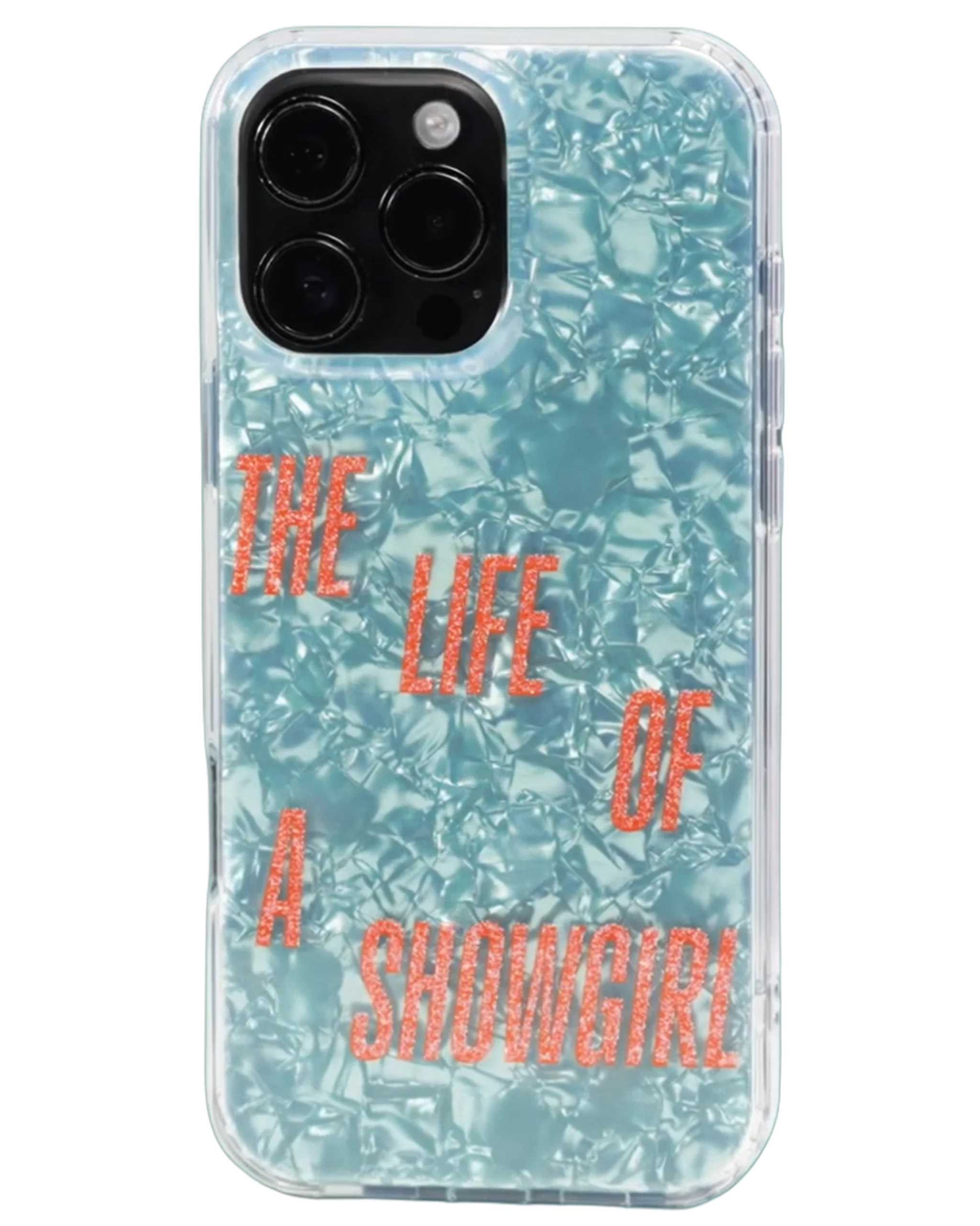 Mint green sparkle pearlescent phone case featuring “The Life of a Showgirl” album logo printed in orange sparkle on case.