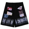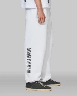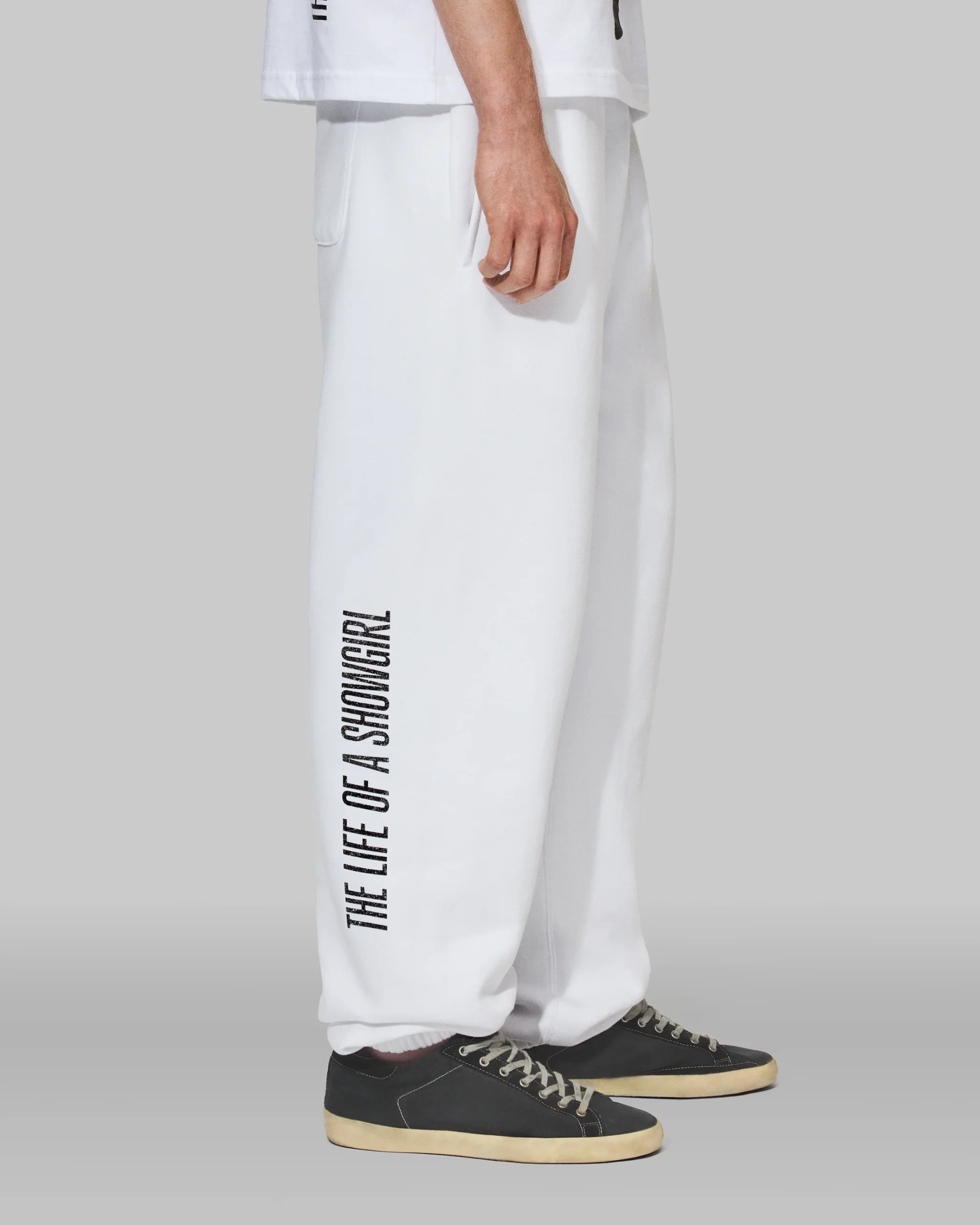 White sweatpants featuring photo of Taylor Swift with black sparkle outfit accents printed down wearer’s left leg and “The Life of a Showgirl” album logo printed down wearer’s right leg.