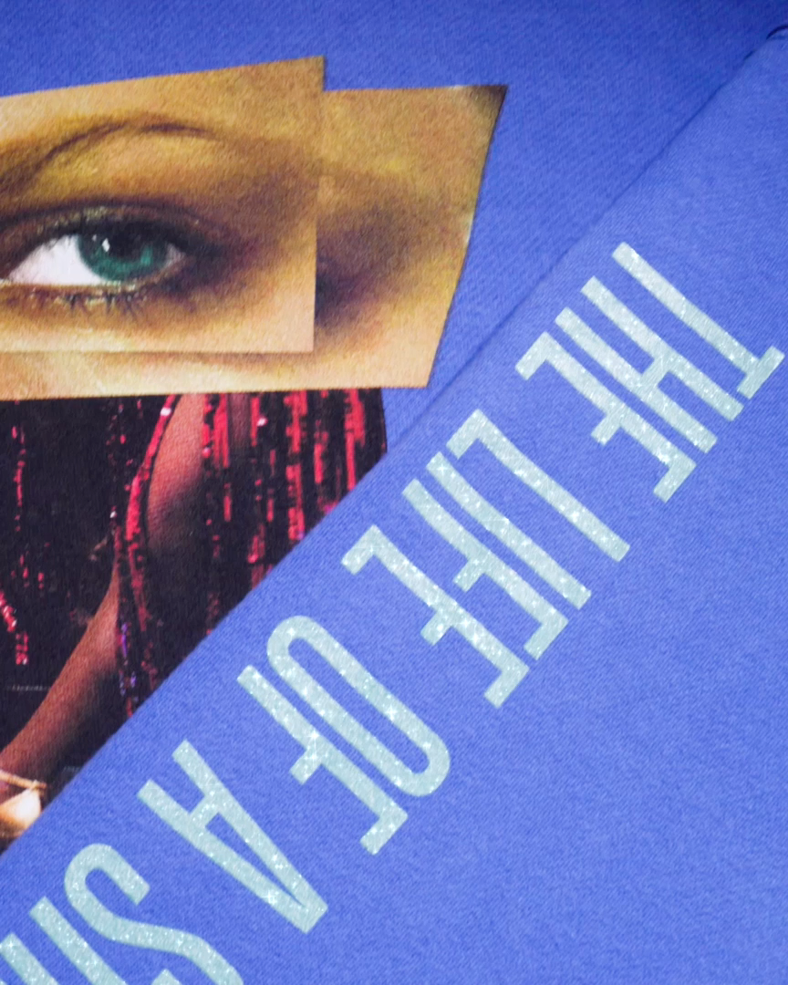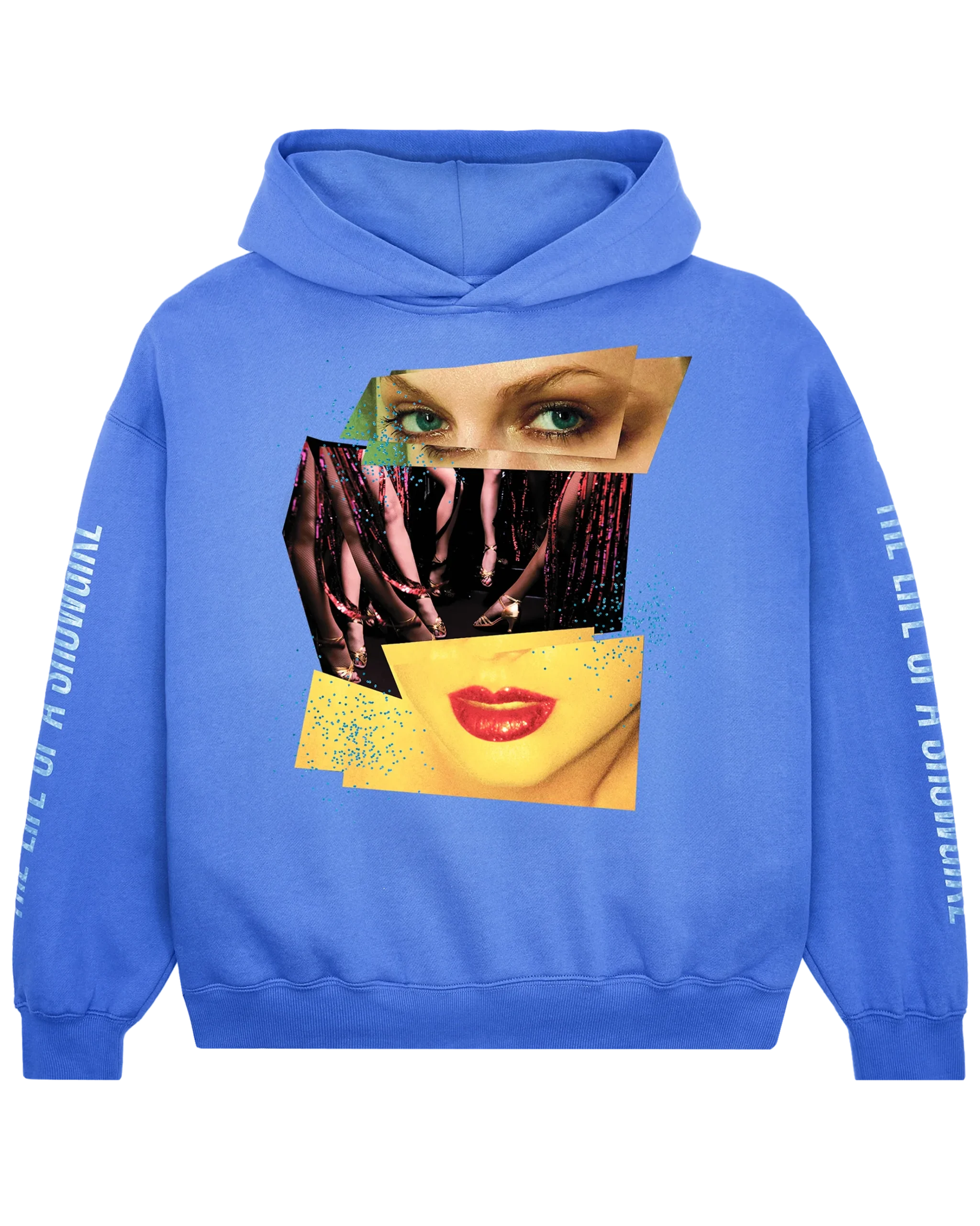 Violet blue hoodie with side pockets featuring mosaic of photos of Taylor Swift printed on front and “The Life of a Showgirl” album logo in mint green sparkle print down both sleeves.