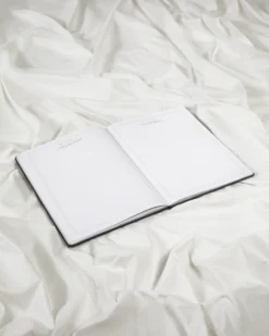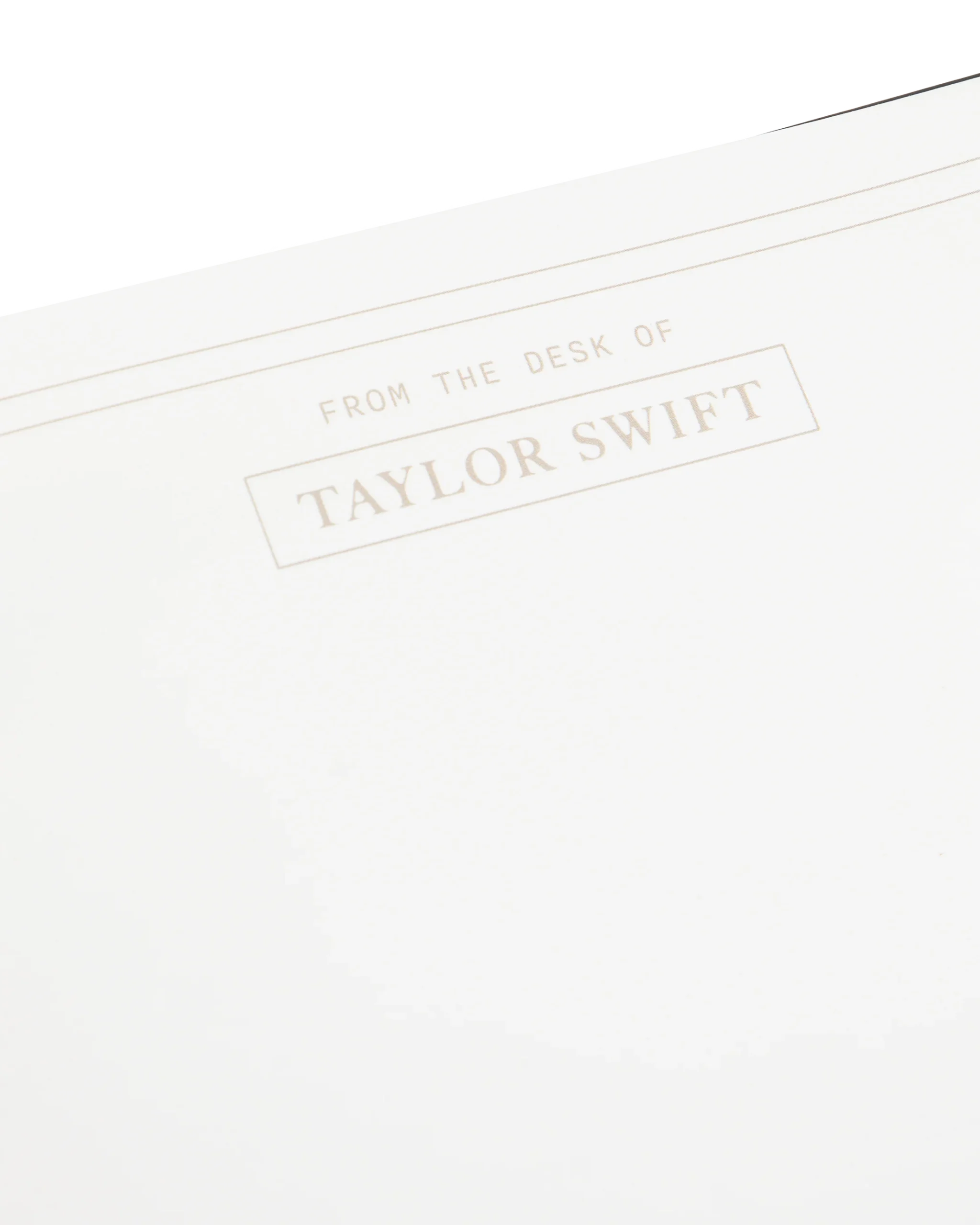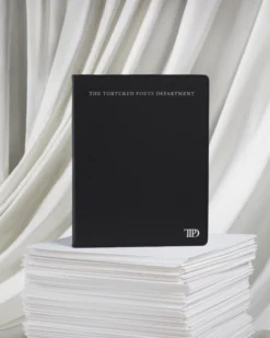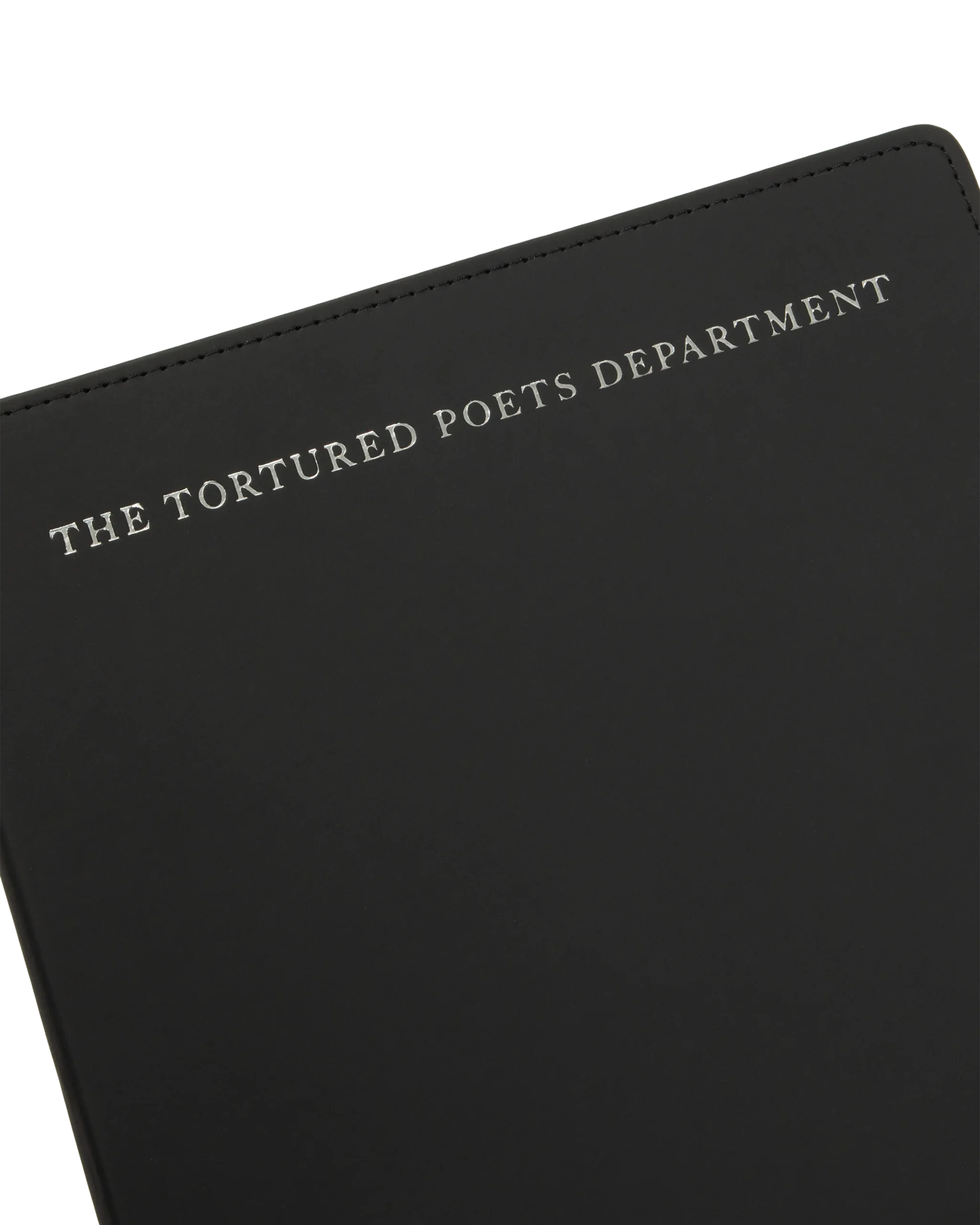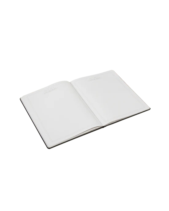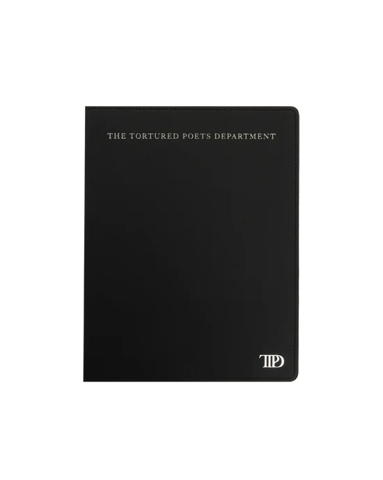Black leather notebook featuring “The Tortured Poets Department” and “TTPD” album logo printed on front in silver foil with double line design and “From The Desk Of” and” Taylor Swift” with box design printed on each page.