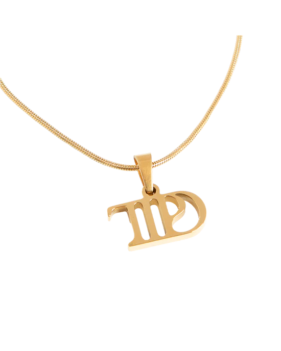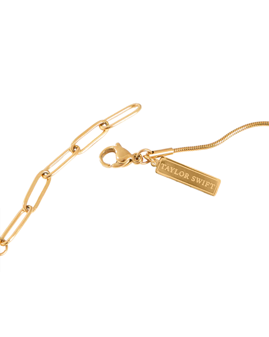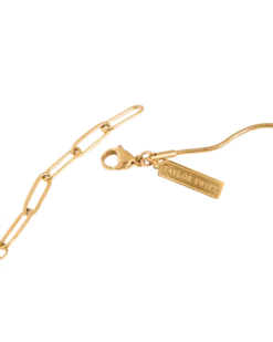 Gold-plated necklace featuring “TTPD” album logo charm, adjustable back closure, and small charm with “Taylor Swift” engraved at clasp. Comes with cotton/poly cinch bag featuring “TTPD” album logo printed on front.