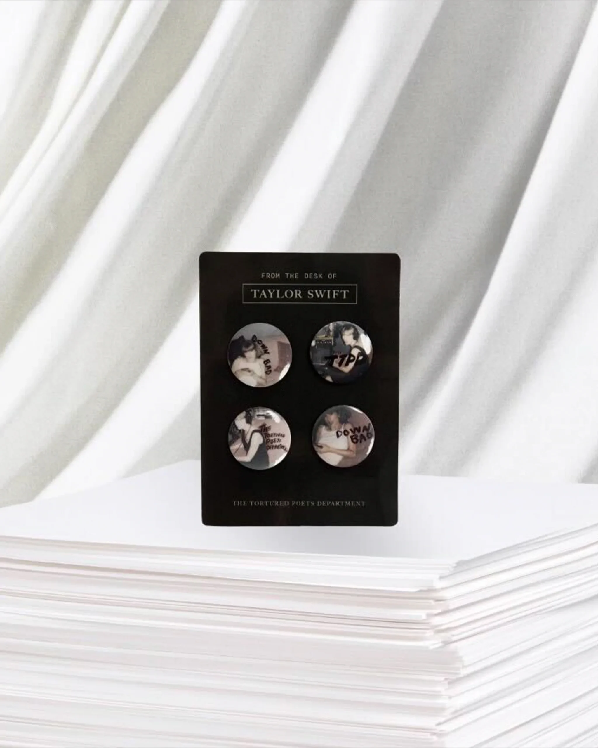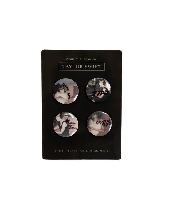 Set of four pins featuring photos of Taylor Swift and “Down Bad” song lyrics, “The Tortured Poets Department”, and “TTPD” printed on front with backer card featuring “From The Desk of”, “Taylor Swift” in box design, and “The Tortured Poets Department” printed on front of card.
