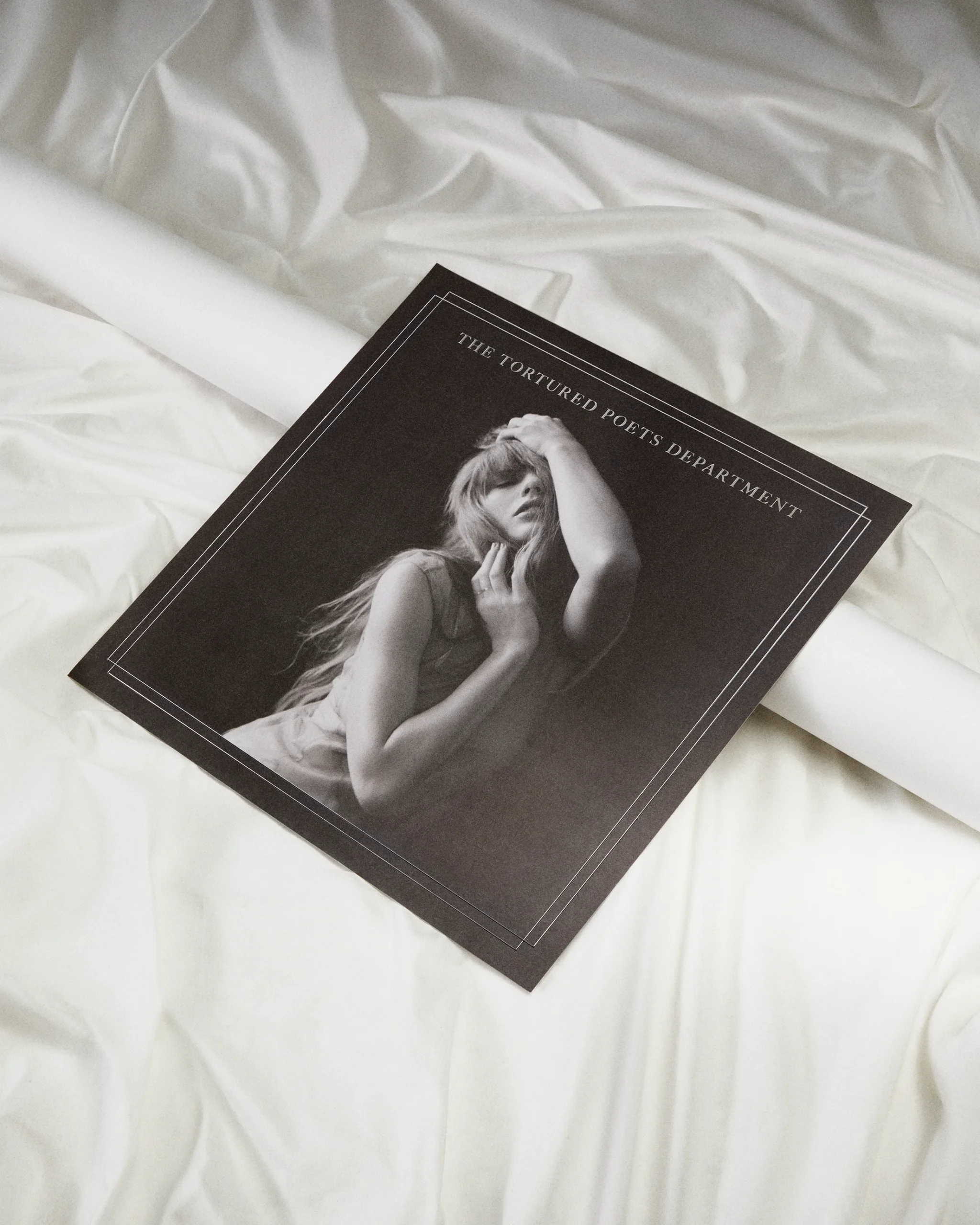 Matte black print featuring photo of Taylor Swift, double line design, and “The Tortured Poets Department” printed on front.