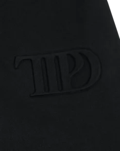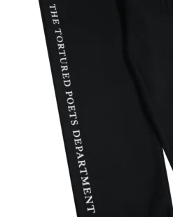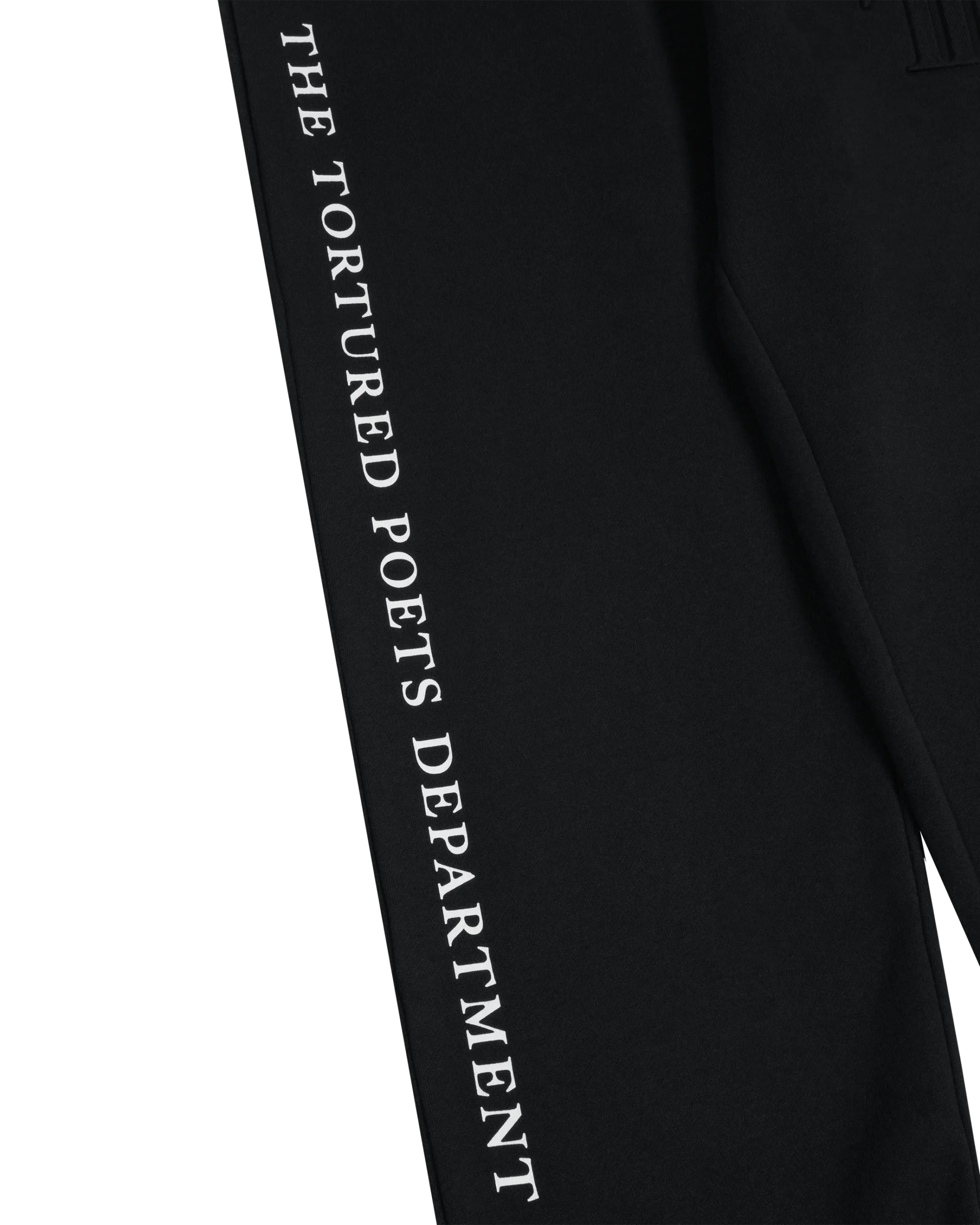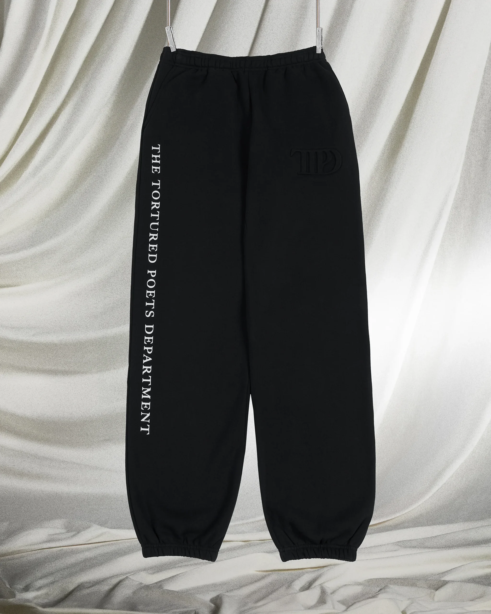 Black sweatpants featuring “TTPD” album logo embossed on wearer’s left leg and “The Tortured Poets Department” printed down wearer’s right leg. Drawstring waist and side pockets.