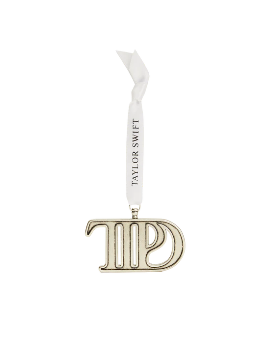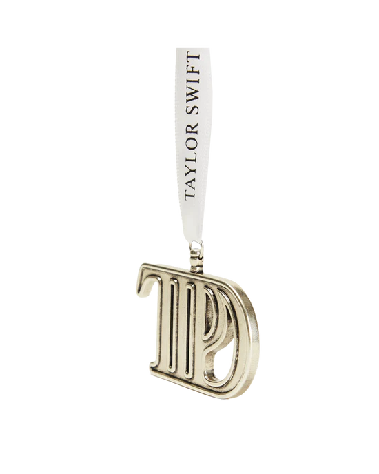 Silver metal TTPD logo ornament with “Taylor Swift” printed on white ribbon.